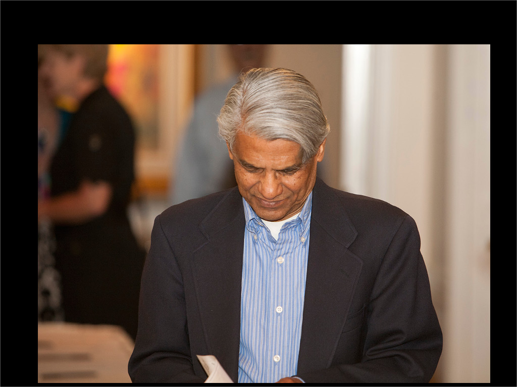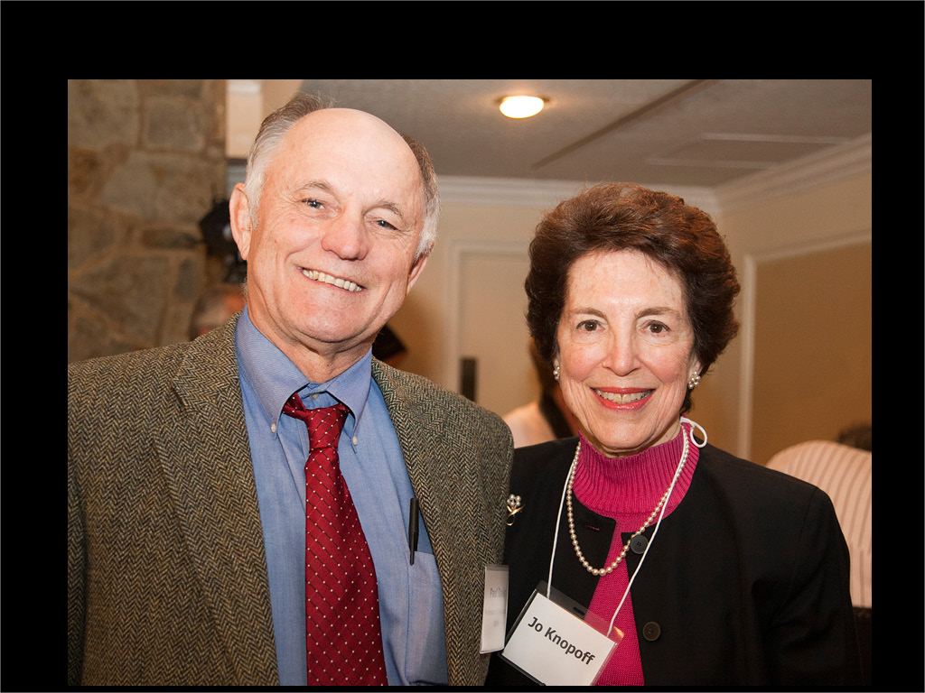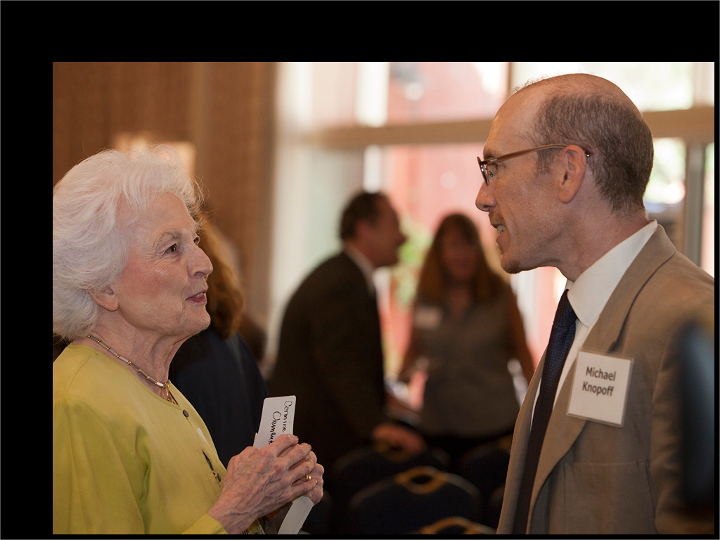 Jo Knopoff greeting a guest; Professor Carmine Clemente in back
