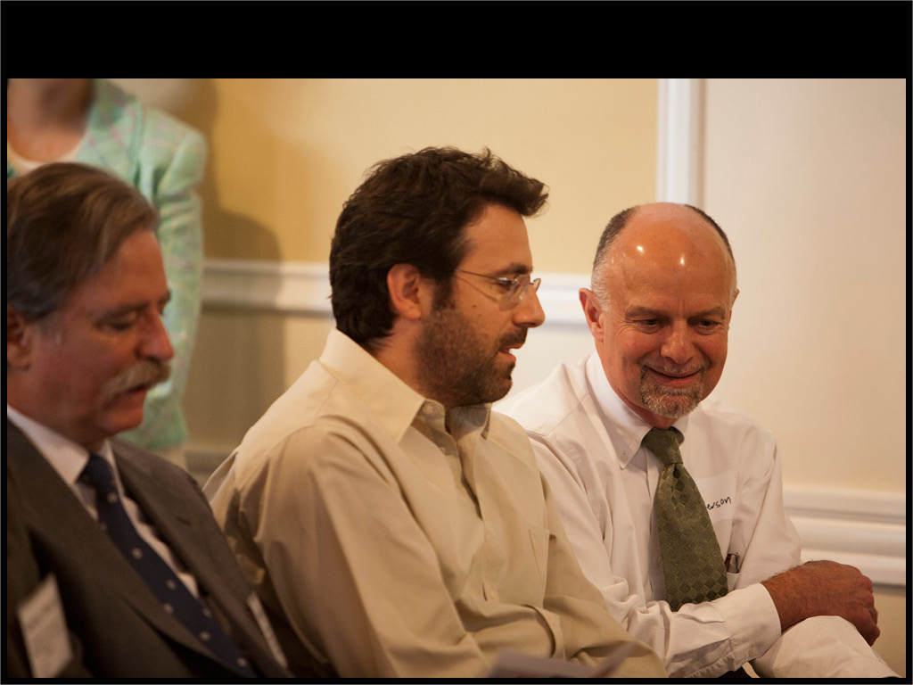 Dr. Jean Elkhoury talking with Dr. Russ Dickerson; Professor Mark Harrison at left