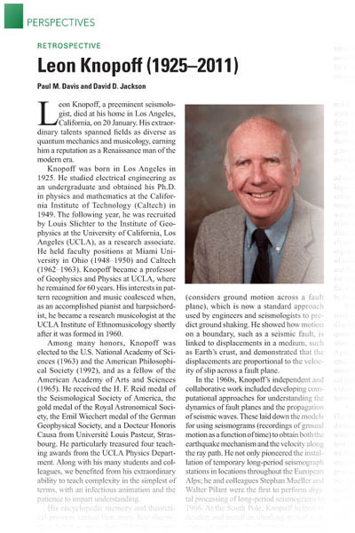 Leon Knopoff, a preeminent seismologist, died at his home in Los Angeles, California, on 20 January. His extraordinary talents spanned fields as diverse as quantum mechanics and musicology, earning him a reputation as a Renaissance man of the modern era.