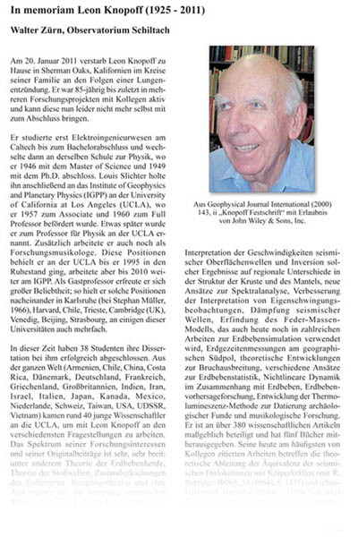 Leon Knopoff selbst hat immer gerne schmunzelnd darauf hingewiesen, dass er die Arbeiten mit dem kürzesten Titel („Q“, Rev. Geophys., 2 (1964), S. 625), mit dem kürzesten Abstrakt „Yes“ als Antwort auf die Titelfrage „Is the sequence of earthquakes in southern California, with aftershocks removed, Poissonian?“ (mit J. K. Gardner: BSSA, 64 (1974), S. 1363) und die Arbeit mit dem wahrscheinlich längsten Wort im Titel („Gruppengeschwindigkeitsmessungen“, mit Götz Schneider und Stephan Müller: Zeitschrift f. Geophysik, 32 (1966), S. 33) (mit-) verfasst hat. Für mich bemerkenswert ist die gemeinsame Publikation zweier heutiger Träger der Emil-Wiechert-Medaille der DGG (Wielandt & Knopoff, JGR, 87 (1982), S. 8631).